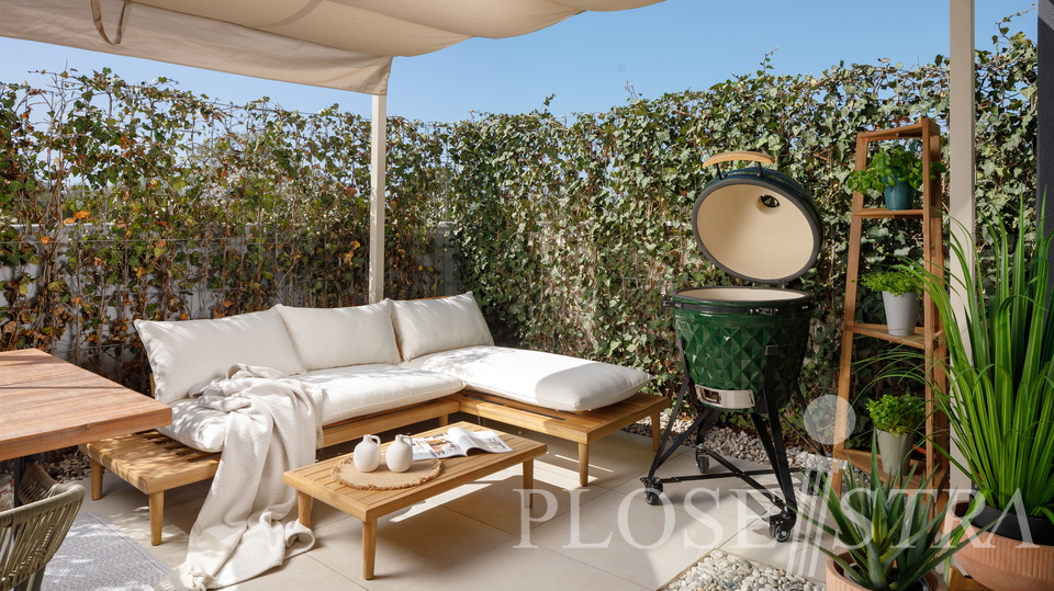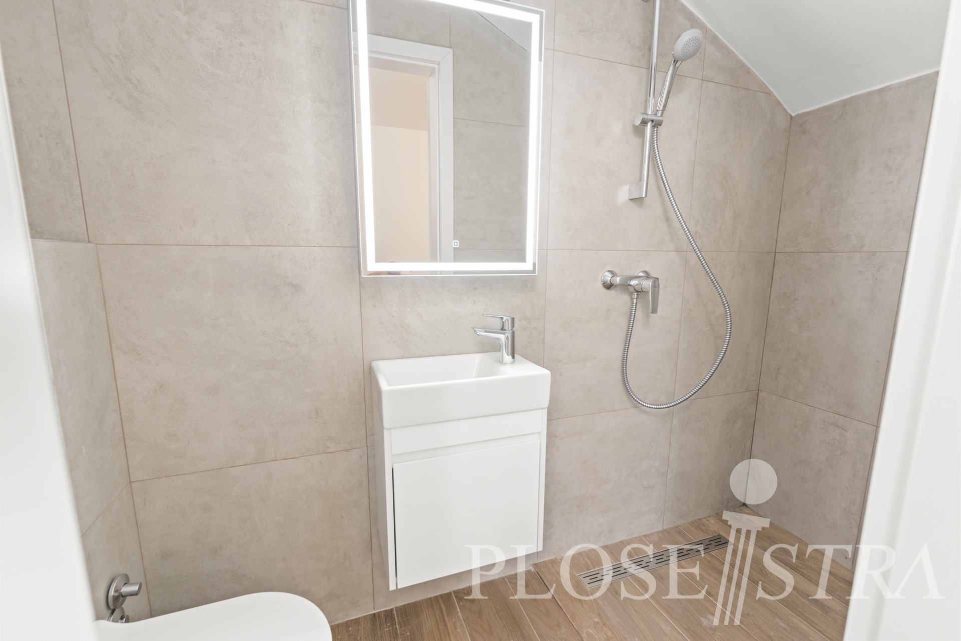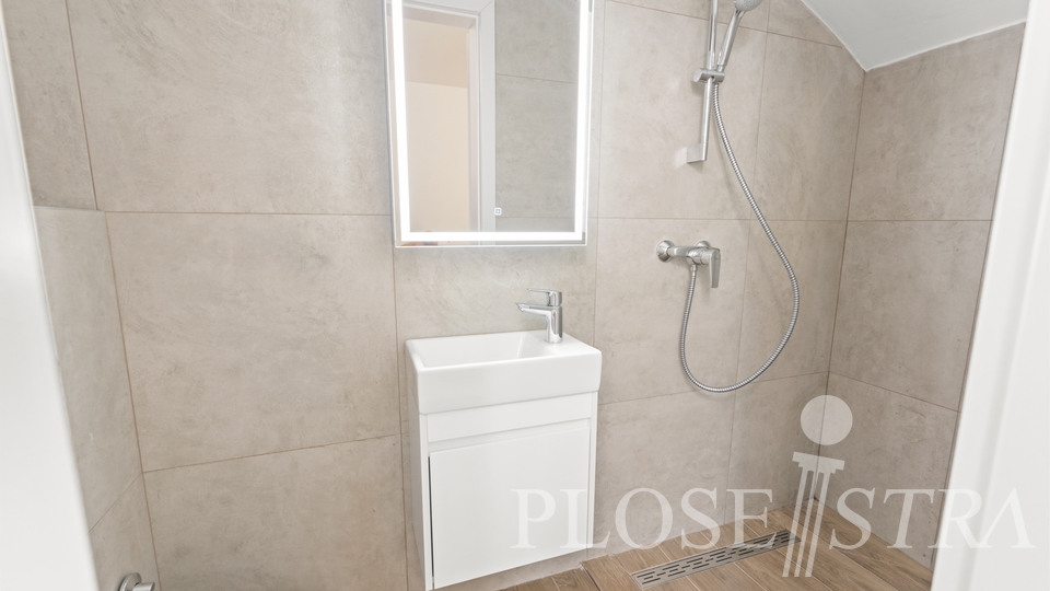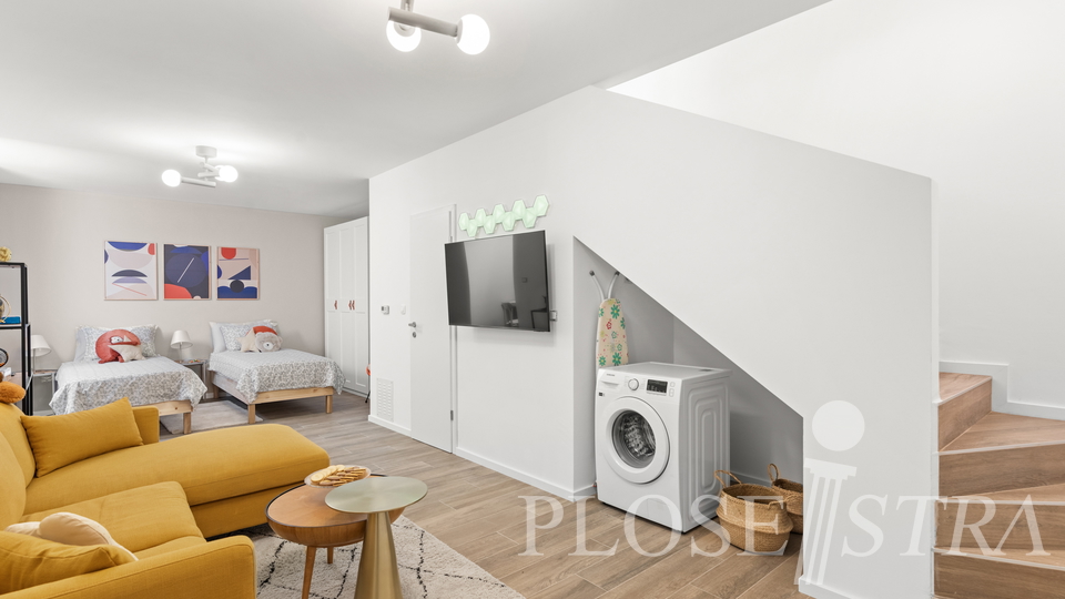 Kući pripada dvorište veličine 92 m2. Unutrašnjost je pažljivo uređena te sadrži dvije spavaće sobe, što je idealno za obitelji ili parove koji traže kvalitetan prostor. Dodatno, u sklopu kuće nalazi se podrum površine 34 m2 koji omogućava dodatni prostor za druženje ili odmor. Opremljena je modernom kuhinjom s aparatima, perilicom posuđa, perilicom rublja, televizorom i krevetom, što olakšava useljenje i svakodnevno funkcioniranje.
